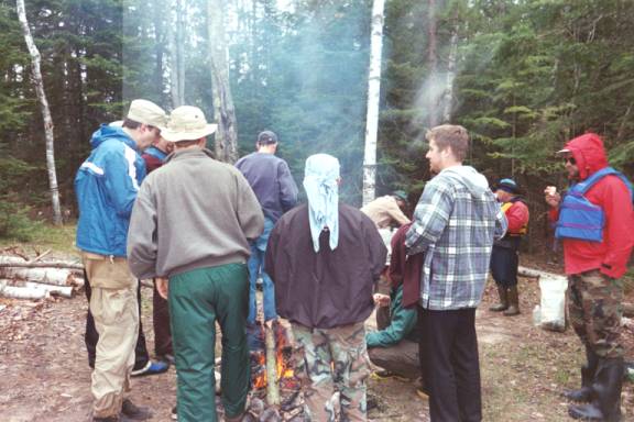 The weather did not clear up for our stop at lunch; in fact a fire was made at lunch to warm the group because too many were cold.